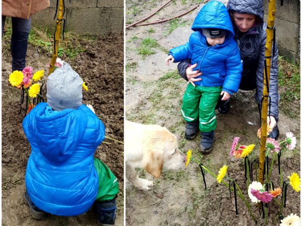 Aztán egyesével odaléptünk a kis fa mellé, az eső áztatta puha földbe beleszúrtuk a színes virágainkat, a fa pici ágaira pedig felkötöttük a gyászunkat jelképező fekete szalagot.