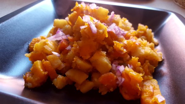 Ha finoman sikerült megkapatni a gumókat és a tököt gusztusosan barnásra, akkor tányérra szedjük és egészen apróra vágott lilahagymával megszórjuk.