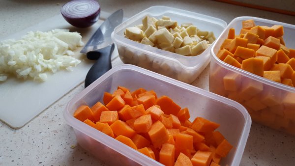 > A sütőtököt meghámozom, megtisztítom a magoktól, és közepes méretű kockákra vágom.